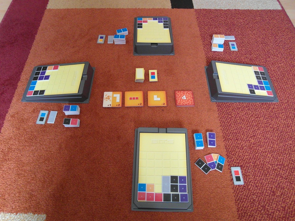 Zu allererst wird eine Aufgabenkarte aufgedeckt. In der ersten Runde ist dies die Karte mit der Nummer 1. Auf der Vorderseite sieht man jetzt, für welche Bauformen man Punkte bekommt. Die Spieler versuchen nun mit ihren Spielsteinen die abgebildete Form als einfarbige Fläche (Farbe in Durchgang 1 beliebig) zu bauen. Ist zum Beispiel ein Würfel aus 4 Feldern abgebildet, bekommt man für jeden Würfel, den man am Ende gebaut hat, zwei Pluspunkte. Baut man hingegen nicht die abgebildete Form, aber dafür eine beliebige einfarbige Form, bestehend aus genau vier zusammenhängenden Feldern, bekommt man dafür immerhin noch einen Punkt.
