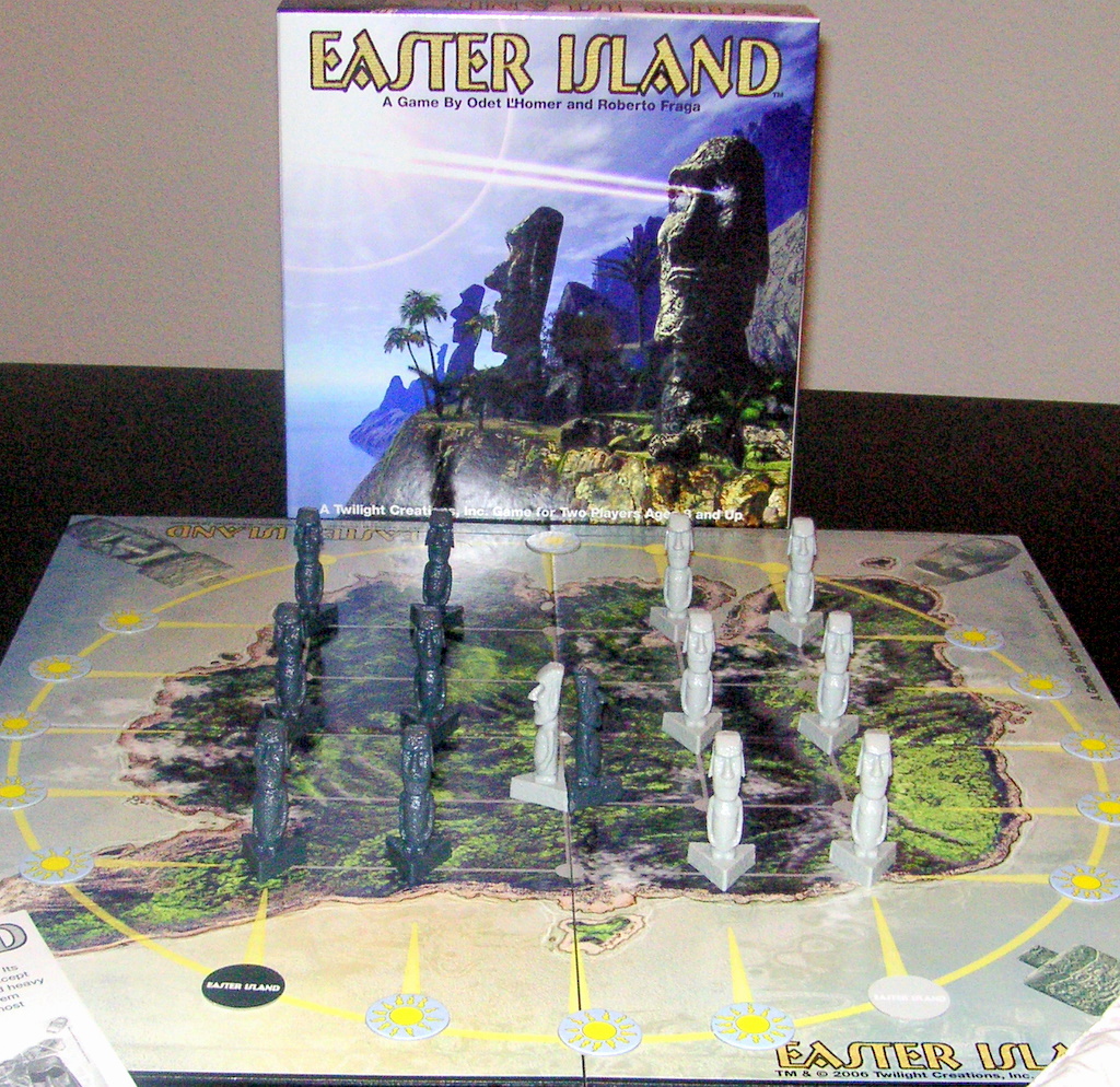 So zumindest soll es laut dem Spiel „Easter Island“ vom – zumindest in Deutschland eher unbekannten – Verlag Twilight Creations Inc., gewesen sein. Mit Easter Island liegt uns im Grunde genommen ein abstraktes Spiel für genau 2 Spieler vor. „Im Grunde genommen“, weil sich dieses Spiel zwar abstrakt spielt, aber die Aufmachung einen Schritt davon weggeht.