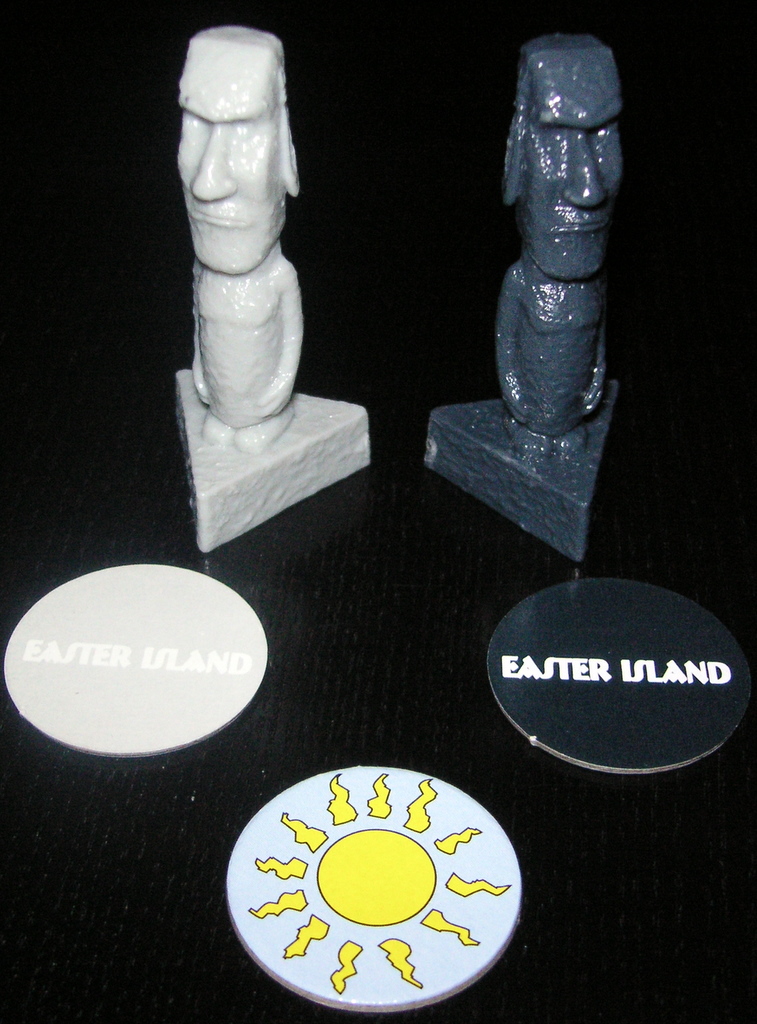 Ich halte es für ein sehr gelungenes Spiel mit einer sehr schicken Aufmachung. Es wurden zwar nur „kleine“ 5 cm hohe Gummi-Moais, welche zudem keine schlimmeren Abdrücke auf dem Fuß hinterlassen, beigepackt, aber dafür muss kein Urlaub auf der Oster-Insel gemacht werden, um dieses geniale Spiel zu spielen. Ich kann es jedem empfehlen, der abstrakte Spiele mag oder zumindest keine strikte Ablehnung gegen solche hat. Die Belohnung ist ein sehr komplexes Spiel mit einem gelungenen Mechanismus, bei dem aufgrund der Reflektionen und der platzierten Sonnen-Marker auf vieles geachtet werden muss. Easter Island braucht sich keineswegs hinter den bekannteren Spielen seiner Art zu verstecken, eher stellt es einige dieser in den Schatten, zur dunklen Seite.