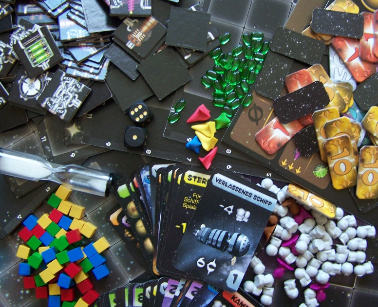 In der Schachtel steckt eine Menge an Material. Neben den 9 Tableaus für die Raumschiffe und die Übersichtskarte, sind Flugkarten, Raumschiffteile, Piloten-, Alien- und Raumschifffiguren, Holzmarker für die Güter, Glasmarker für die Energie, Pappmarker für das Geld, eine Sanduhr und Würfel enthalten. Auch die Spielanleitung sollte besonders hervorgehoben werden. Sie ist locker und witzig geschrieben und gibt einen schnellen und unterhaltsamen Einstieg in das Spiel.