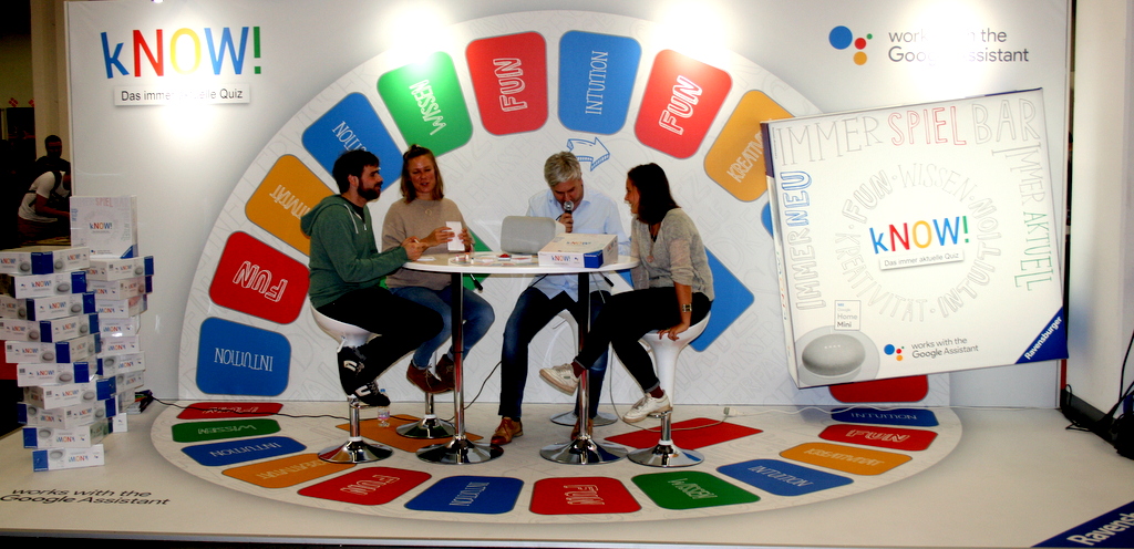 Einen neuen Ansatz verfolgt Ravensburger mit dem Quizspiel “kNOW!”. Die Besonderheit ist die Einbindung des Google Sprach – Assistenten, der ja auf jedem Android Handy bereits vorinstalliert ist und meist nur noch aktiviert werden muss. Einen besonderen Komfort bietet der Google Assistent Speaker, der direkt mit dem Spiel zusammen auf den Tisch gestellt werden kann.