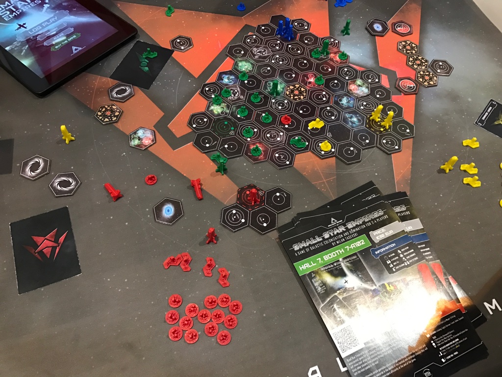 Milan Tasevski präsentierte uns das über Kickstarter finanzierte Small Star Empires. Das kompakte Area-Control Spiel lässt sich innerhalb von 15 Minuten spielen und bietet auch eine eigene Smartphone App, welche die Regeln erläutert und Szenarien für die Startaufstellungen präsentiert.