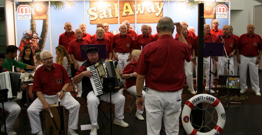 Die gesamte Neuheitenschau findet in einer gesonderten Halle statt, die groß genug für die Präsentation aller Spiele ist.  In den letzten Jahren haben Verlage gern auch Prominente zur Präsentation eingespannt, etwas Kaya Yanar, Steffen Henzler oder Matthias Steiner. In diesem Jahr haben wir keine Promis gesehen, dafür eine hervorragende Darbietung eines Shantychors zur Präsentation des Spiels „Sail Away“ bei Mattel.