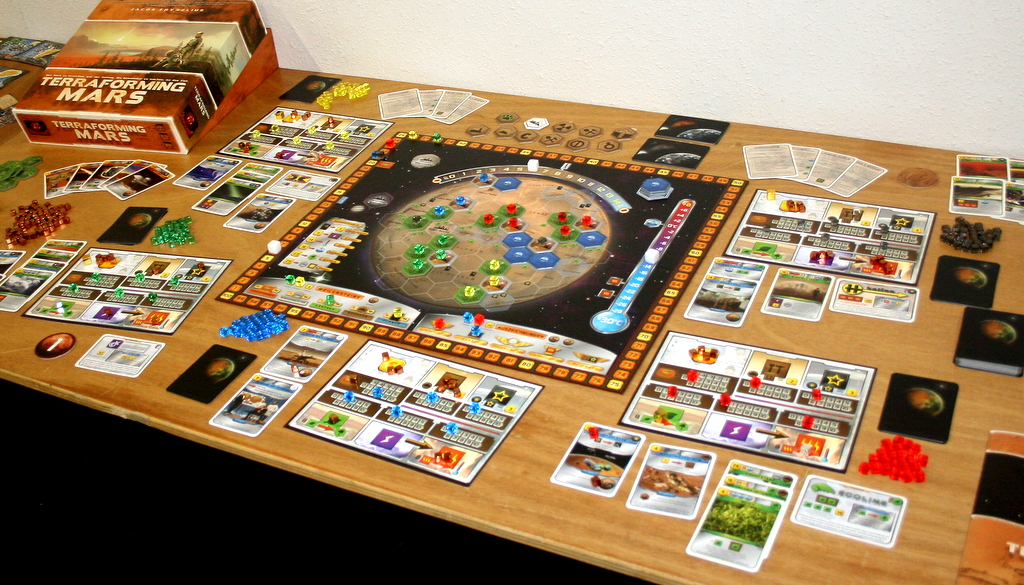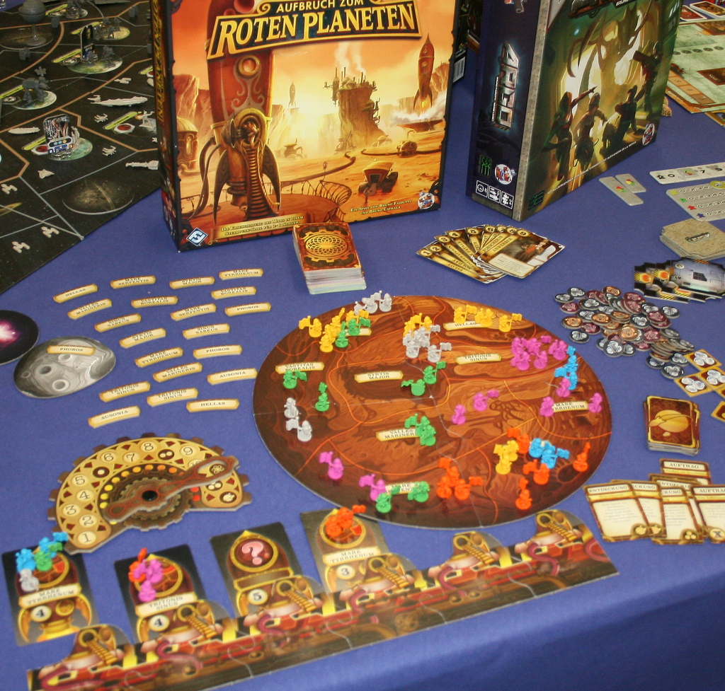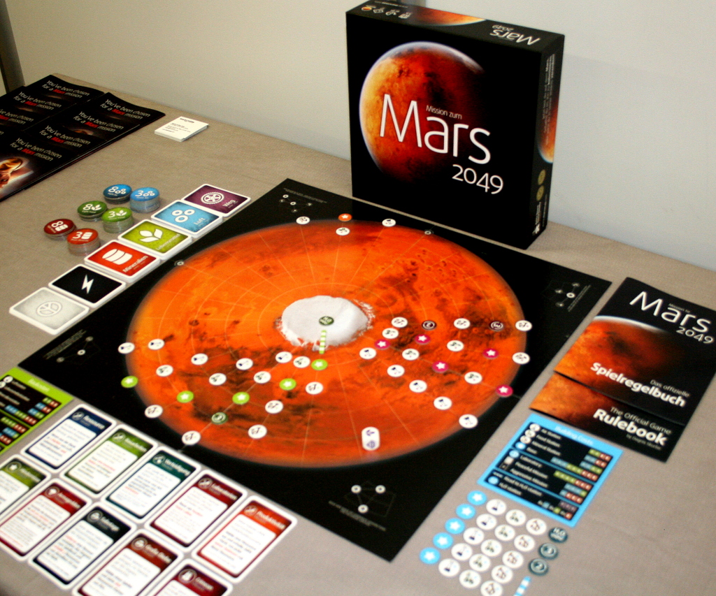 Mission to  Mars 2049 vom lettischen Verlag Black ‚N‘ White Games sorgt für Leben auf dem Mars, jedoch in etwas abstrakterer Aufmachung. Auch Bruno Cathala und Bruno Faidutti machen sich mit der zweiten Auflage von „Aufbruch zum roten Planeten“ auf den Weg. Portal Games zeigt ebenfalls ein Mars Spiel, das aber erst 2017 erscheinen wird.