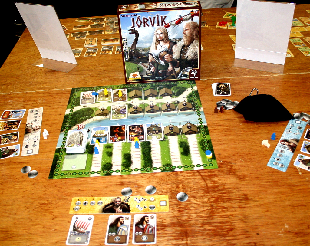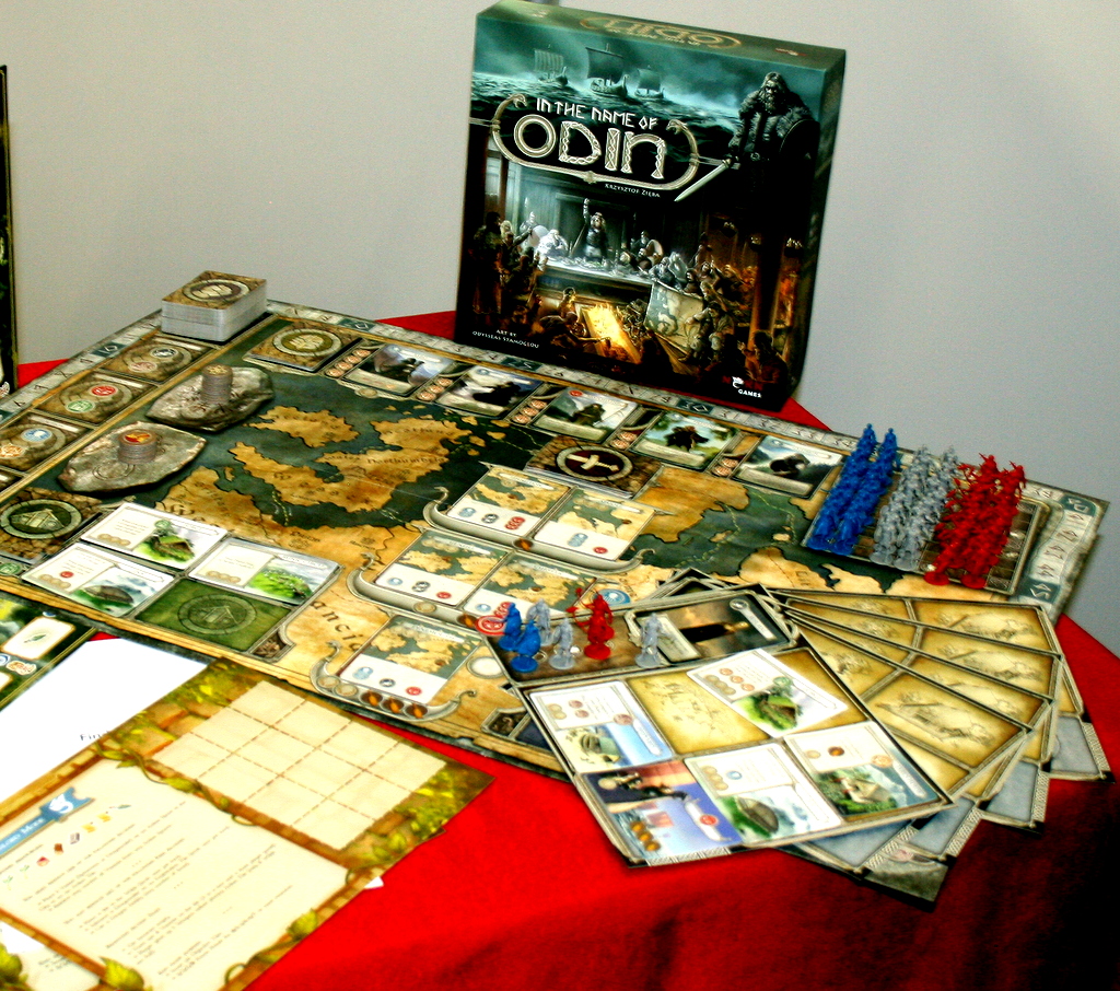 Der germanische Gott Odin hat es in diesem Jahr auf zwei Spieltitel geschafft. Feuerland Spiele präsentiert endlich  Uwe Rosenbergs „Ein Fest für Odin“, nachdem dieses Material- Schwergewicht mit einem Jahr Verzögerung die Veröffentlichung geschafft hat. Beim polnischen Verlag  NSKN Games  finden wir dann mit dem Kickstarter-gefundeten „In the Name of Odin“ ein Spiel mit ähnlichem Namen, jedoch völlig anderer Aufmachung. Jorvik bei Pegasus Spiele indes ist ein Spiel mit Wikinger – Thema, dessen Mechanik bereits bei „die Speicherstadt“ verwendet wurde. Mystisch daher kommt Nine Worlds vom englischen Verlag „Medus Games“, dessen Spielbrett an Blood Rage erinnert. Der Schwerkraft – Verlag hatte nur sehr wenige Exemplare von Räuber der Nordsee dabei, welches es nach der Messe in größerer Zahl verfügbar sein wird.