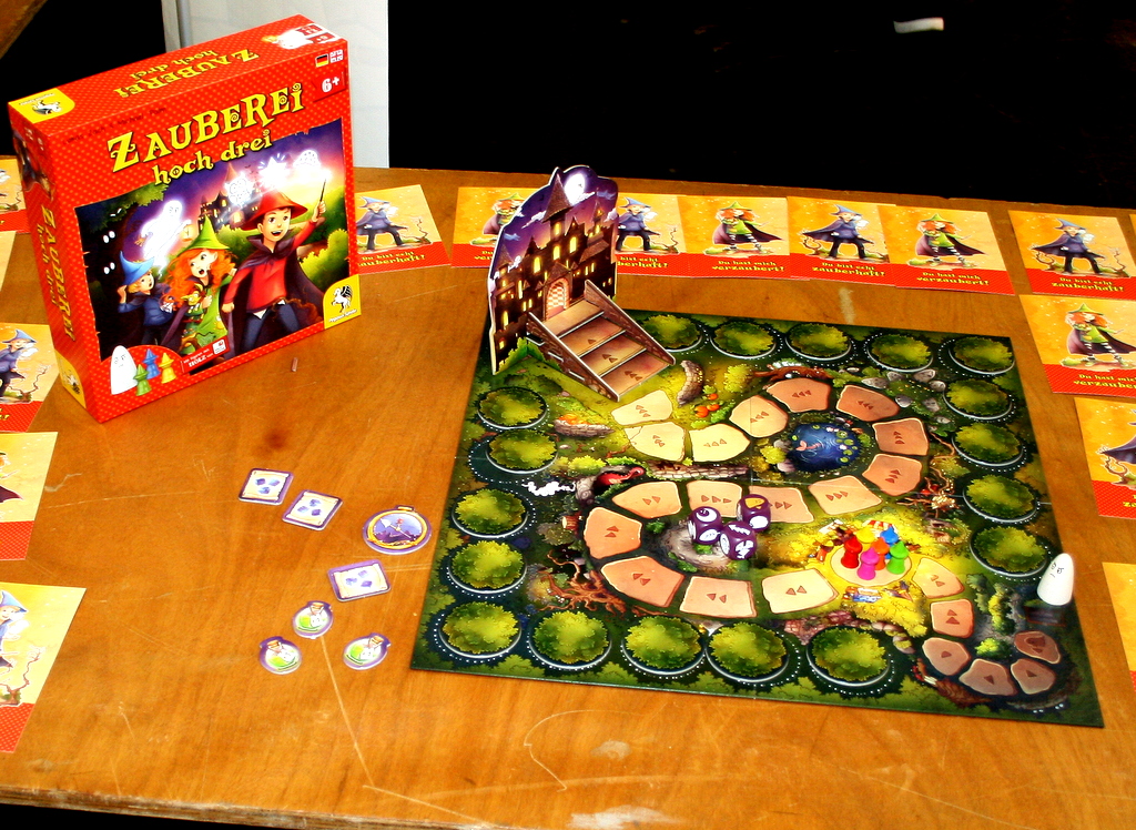 Pegasus hat ein weiteres Selecta Spiel neu aufgelegt: Zauberei hoch Drei ist ein Rennspiel mit Merk-Komponente, bei dem die Spieler durch einen Wald zur Zauberschule laufen und sich dinge merken müssen, die sie im Wald finden. Sind sie zu langsam, werden sie von einem Geist eingeholt und verlieren das Spiel. Dr. Eureka, ebefalls bei Pegasus erschienen,  fordert uns auf, bestimmte Mixturen herzustellen. dabei werden Kugeln in Reagenzgläsern nach einer Vorlage umverteilt. wer dies am schnellsten schafft, gewinnt das Spiel.