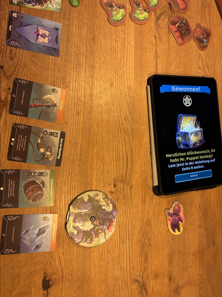 Wie schon angesprochen, ein Spiel mit App Unterstützung unter Nutzung von QR Codes. Gemeinsam als Helden bekämpfen wir ein Boss-Monster. Die eigenen Karten werden zum Ausspielen gescannt und lösen dann in der App Effekte aus. Schaden, Schilde und Effekte werden dort nachgehalten. Bietet aktuell vier Schwierigkeitsgrade und zehn Bosse die es nacheinander zu besiegen gilt. Könnte ein großer Hit werden in diesem Jahrgang.