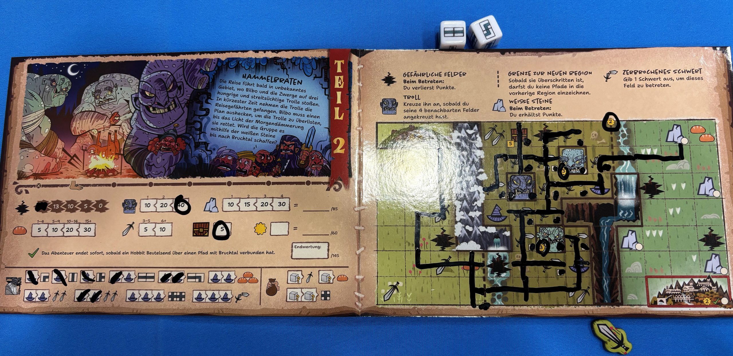 In diesem Roll & Write begeben wir uns in Tolkiens Hobbit und bestehen insgesamt acht Abenteuer. Hervorzuheben ist hier erst mal das Material, welches wie ein dickes Kinderbuch die Spielpläne bietet. Wir haben nur ein Szenario angespielt, welches mechanisch gut funktionierte. Ob das Gesamtpaket mit allen Szenarien am Ende für alle lohnenswert oder nur etwas für Fans ist, werden wir noch sehen müssen.