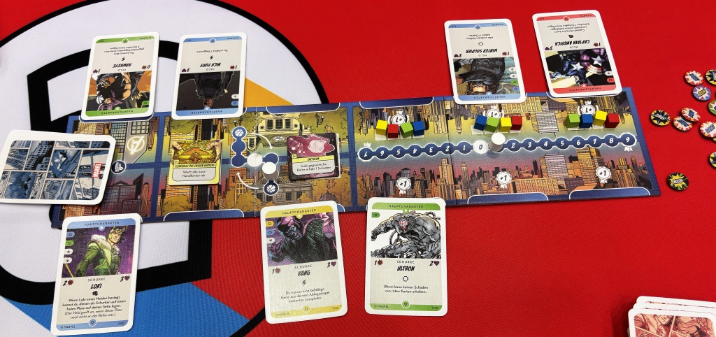 In diesem Duell Spiel kämpfen Superhelden gegen Schurken. Beide Seiten haben ein eigenes Deck und kämpfen an sechs Standorten gegeneinander um Siegpunkte. Auf den ersten Blick hatte ich ein seichtes Duell Spiel auf Familienniveau erwartet, wurde aber durch die verschiedenen Karten und Effekte überrascht. Wenn durch geschickte Kombinationen die komplette Auslage des Gegenübers besiegt wird, fühlte es sich sehr befriedigend an. Werden wir uns nochmal genauer ansehen.