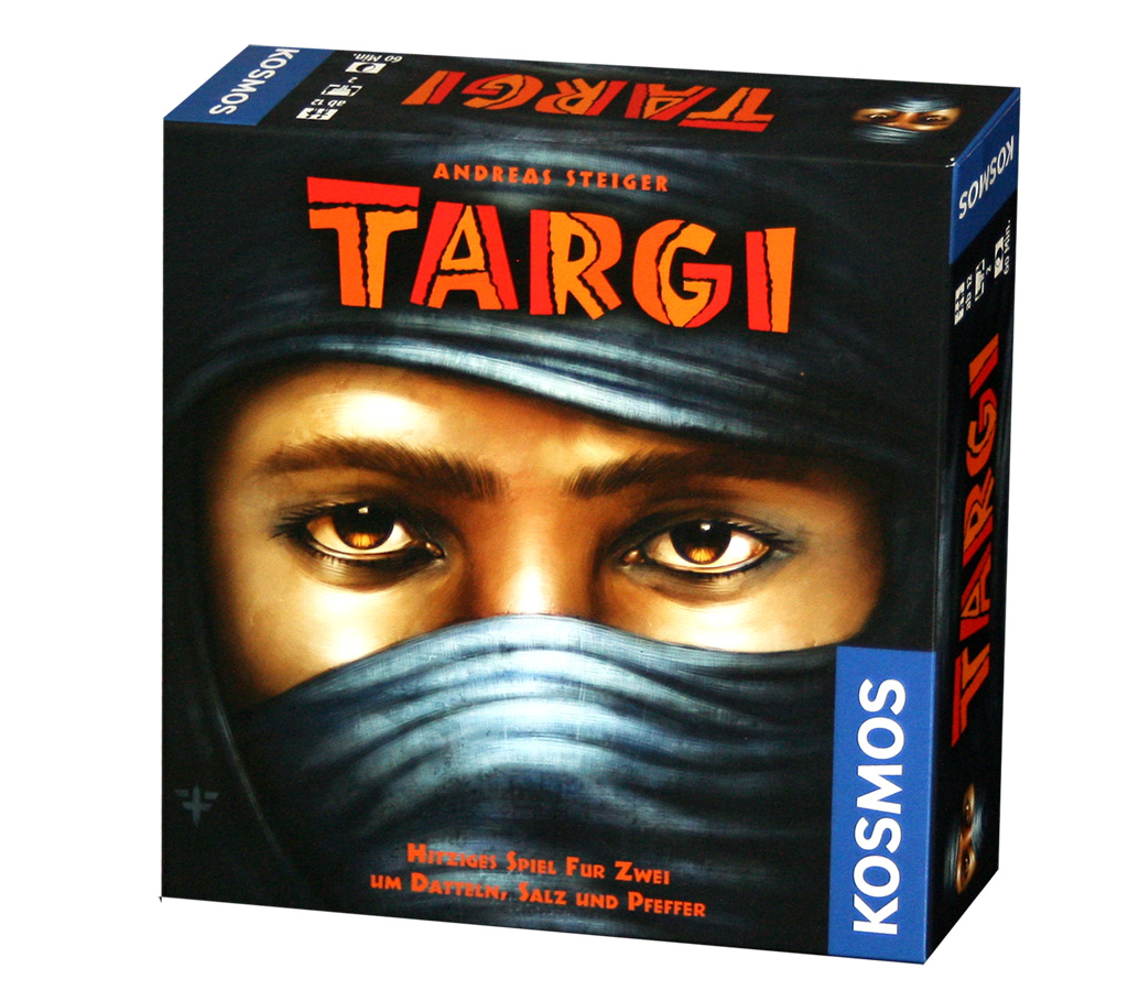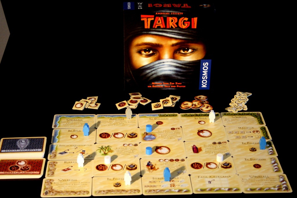 targiIn Targi, einem Spiel für zwei Spieler von Andreas Steiger, schauen wir, wie das Leben in einem afrikanischen Wüstenvolk so vonstatten geht. Bei den Tuareg konkurrieren zwei Stämme in einer Oase um die besten Handelsverbindungen, um Gold, Waren und Einfluss. Die Stämme schicken ihre Targi (die männlichen Tuareg) aus, um durch geschicktes Taktieren den größten Einfluss zu erhalten.