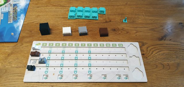 Jeder Spieler bekommt sein persönliches Tableau, stellt die Maschinen-Marker seiner Farbe ganz links darauf, nimmt die zehn farbigen Dächer sowie den zugehörigen Kegel-Marker und legt je ein Stockwerk jeder Farbe als Start-Vorrat vor das Tableau. Die drei mit „S“ gekennzeichneten Zielkarten werden offen auf die vorgesehenen Felder des Plans gelegt und die Bonus-Chips nach Spielerzahl auf die Ablageplätze gestellt.