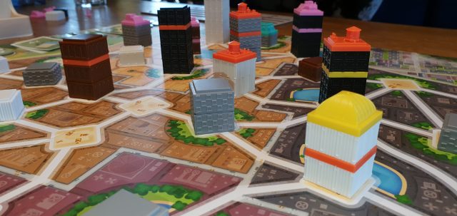 Die Stockwerke sind durch ihre Farben gut zu unterscheiden und angenehm strukturiert, was das Bauen intuitiv und haptisch ansprechend macht. Besonders gelungen finde ich die Dächer der Spieler– jedes mit eigenem Charakter: mal industriell, mal modern, mal fast schon „annohaft“ und einmal eher prachtvoll. Ein schönes Detail, das Persönlichkeit ins Stadtbild bringt.