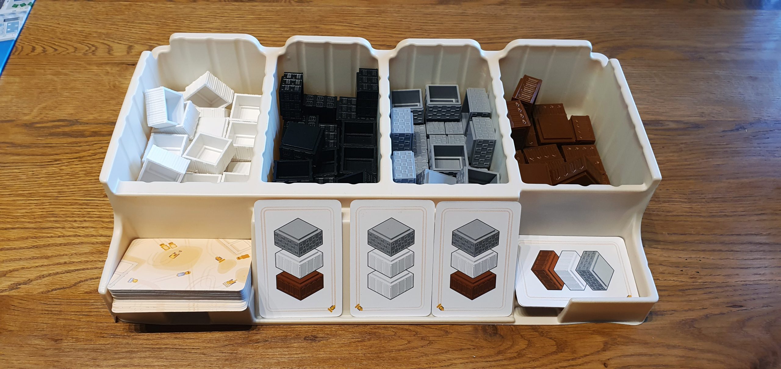 Das Spielmaterial macht auf den ersten Blick einen hochwertigen Eindruck, auch wenn fast alles aus Kunststoff besteht. Gerade bei den Maschinenmarkern hätte ich mir persönlich Holz gewünscht – einfach, um das Plastikaufkommen etwas zu reduzieren. Dafür punkten die Spieltableaus mit praktischen Vertiefungen, in denen alle Marker sauber liegen bleiben. So bleibt alles übersichtlich, selbst wenn auf dem Tisch gerade die Hochhäuser wachsen.