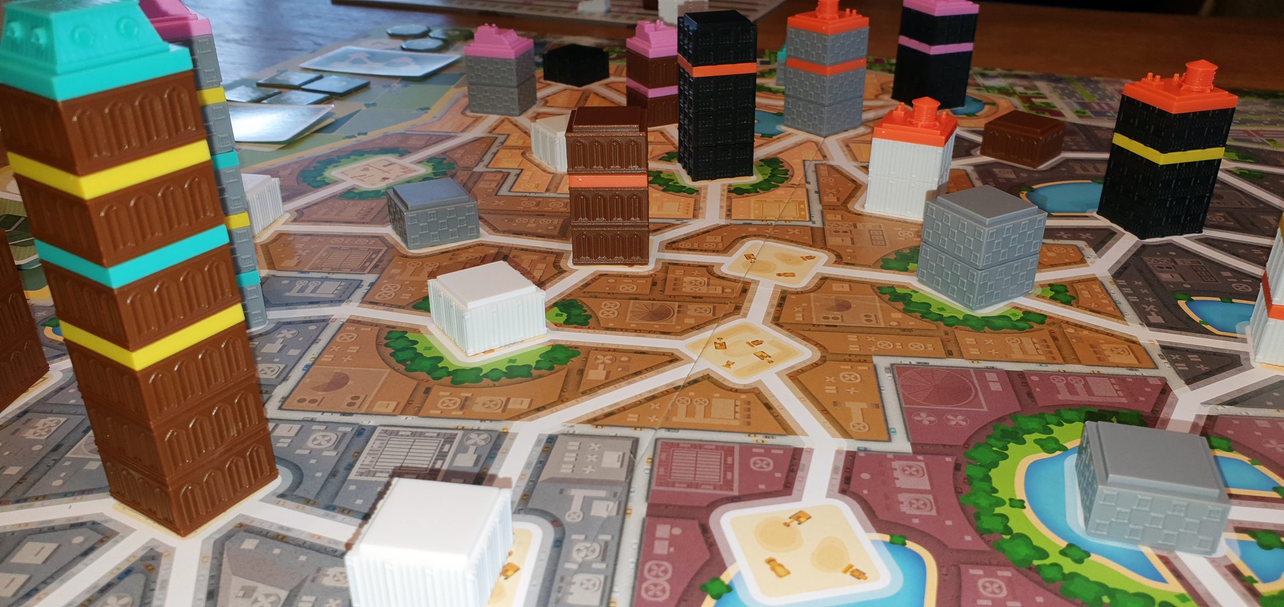 Die Stockwerke sind durch ihre Farben gut zu unterscheiden und angenehm strukturiert, was das Bauen intuitiv und haptisch ansprechend macht. Besonders gelungen finde ich die Dächer der Spieler– jedes mit eigenem Charakter: mal industriell, mal modern, mal fast schon „annohaft“ und einmal eher prachtvoll. Ein schönes Detail, das Persönlichkeit ins Stadtbild bringt.