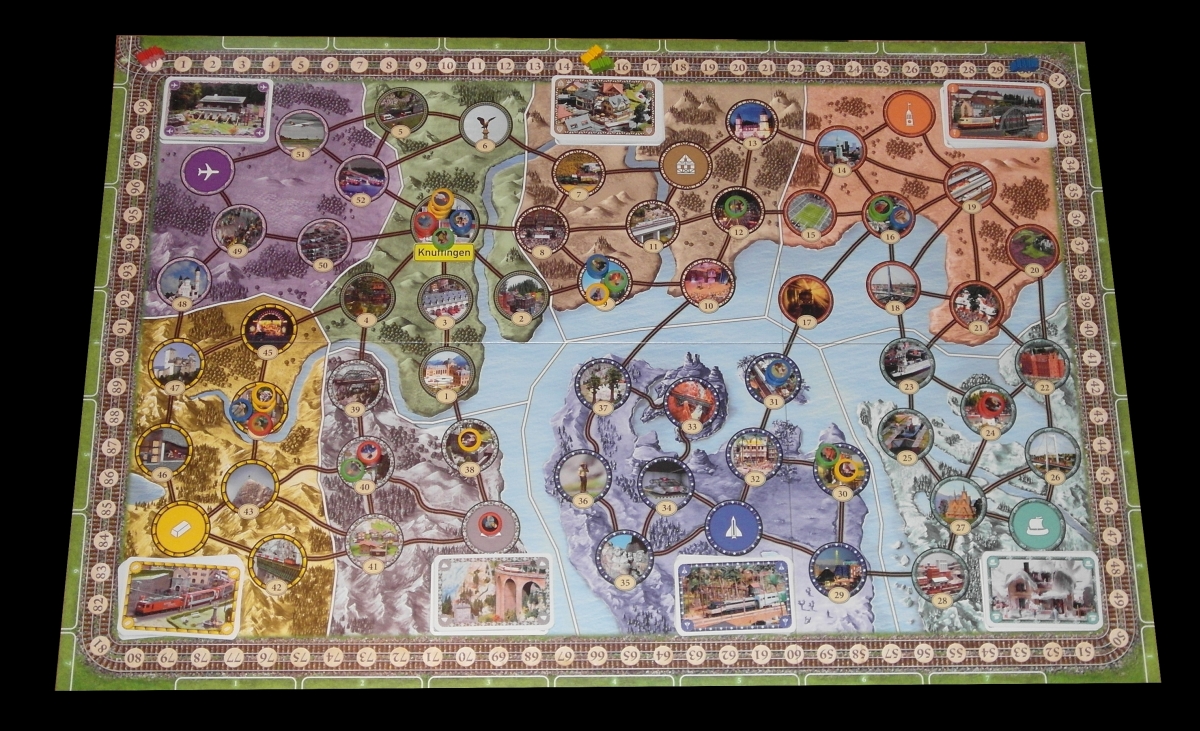 Das hat den Vorteil, dass man weit entfernte Orte durchs Mitreisen viel schneller erreichen kann, vorausgesetzt, ein Spieler möchte auch in diese Richtung ziehen. Wenn sich mindestens ein Reisender der eigenen Farbe auf allen Orten der Zielkarte befindet, gilt die Karte als erfüllt. Die Figuren wandern wieder nach Knuffingen zurück und es wird eine neue Zielkarte gezogen (max. 5).